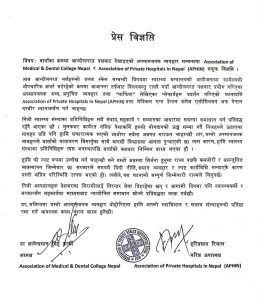 संघहरूले यस्ता परिस्थितिको जिम्मेवारी राज्य पक्षकै कमजोरी र असन्तुलित व्यवस्थापनका कारण सिर्जना भएको ठहर गर्दै सरकारले समयमै दिगो नीति, समान व्यवहार र स्पष्ट कार्यविधि नल्याएकै कारण अप्रिय स्थिति उत्पन्न भएको बताएका छन् । ‘निजी अस्पतालहरू देशभरका बिरामीलाई निरन्तर सेवा दिइरहेका छन् र आगामी दिनमा पनि स्वास्थ्यकर्मी तथा सरकारसँग सहकार्यका माध्यमबाट न्यायोचित समाधान खोज्ने प्रतिबद्धता व्यक्त गर्दछौं । तर, भविष्यमा यस्तो अपमानजनक व्यवहार दोहोरिएमा हामी आफ्नो स्वाभिमान र सदस्य संस्थाहरूको प्रतिष्ठा रक्षा गर्न आवश्यक कदम चाल्न बाध्य हुनेछौं ।’ एसोसियसन अफ प्राईभेट हेल्थ ईन्टिच्युसन अफ नेपाल (अफिन) का अध्यक्ष डा। ज्ञानेन्द्रमानसिं कार्की र एसोसिएसन अफ मेडिकल एण्ड डेन्टल कलेज अफ नेपालका बरिष्ठ उपाध्यक्षद्वारी जारी विज्ञप्तिमा भनिएको छ ।