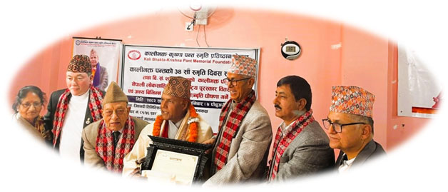 काठमाडौं । कालीभक्त–कृष्णा पन्त स्मृति प्रतिष्ठानले कालीभक्त पन्त नेपाली लोकसाहित्य अन्तर्राष्ट्रिय पुरस्कार नेपाली लोक संस्कृति एवं नेपालको सुदूर प्रश्चिममा प्रख्यात देउडाका सम्राट नन्दकृष्ण जोशीलाई प्रदान गरेको छ । प्रतिष्ठानको ३४ औँ स्मृति दिवसको अवसरमा एक भव्य समारोह गरी उक्त पुरस्कार प्रदान गरिएको हो । समारोह प्रतिष्ठानका अध्यक्ष प्रा।डा। पार्थिवेश्वर प्रसाद तिमिल्सिनाको सभापतित्व तथा प्रा.डा. खगेन्द्रप्रसाद लुइटेलको प्रमुख आतिथ्यतामा भएको थियो ।